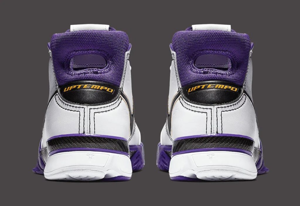 Accents: Yellow/gold details appear on the tongue branding, including Kobe’s shield logo; “UPTEMPO” text is embroidered on the heel in a nod to the original.