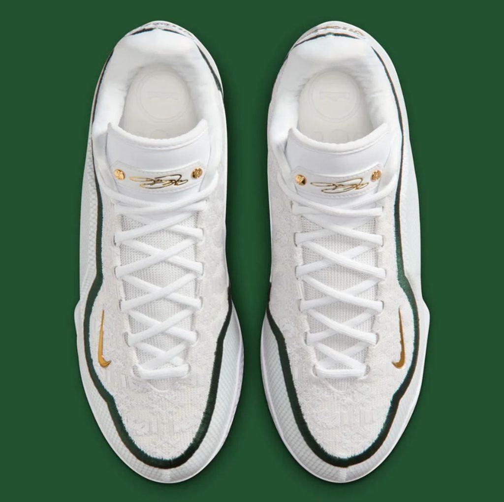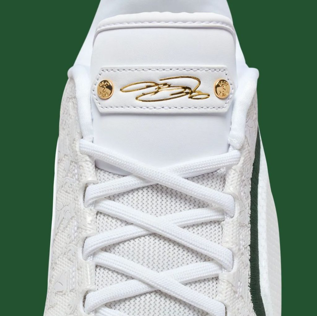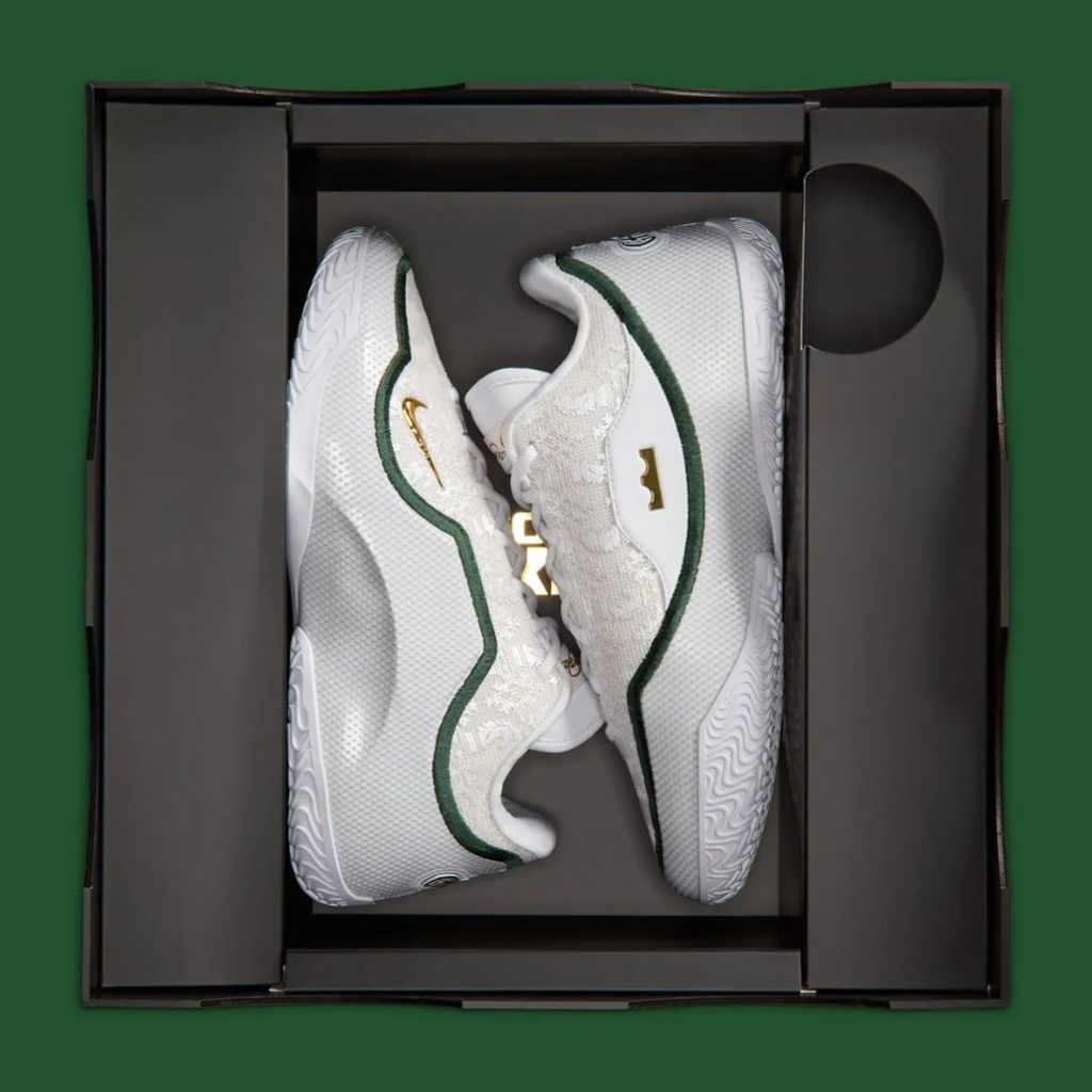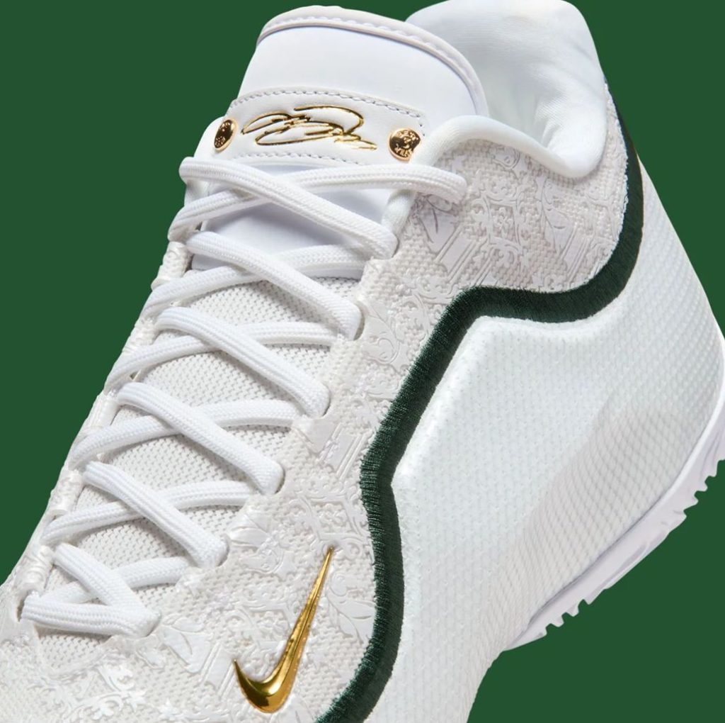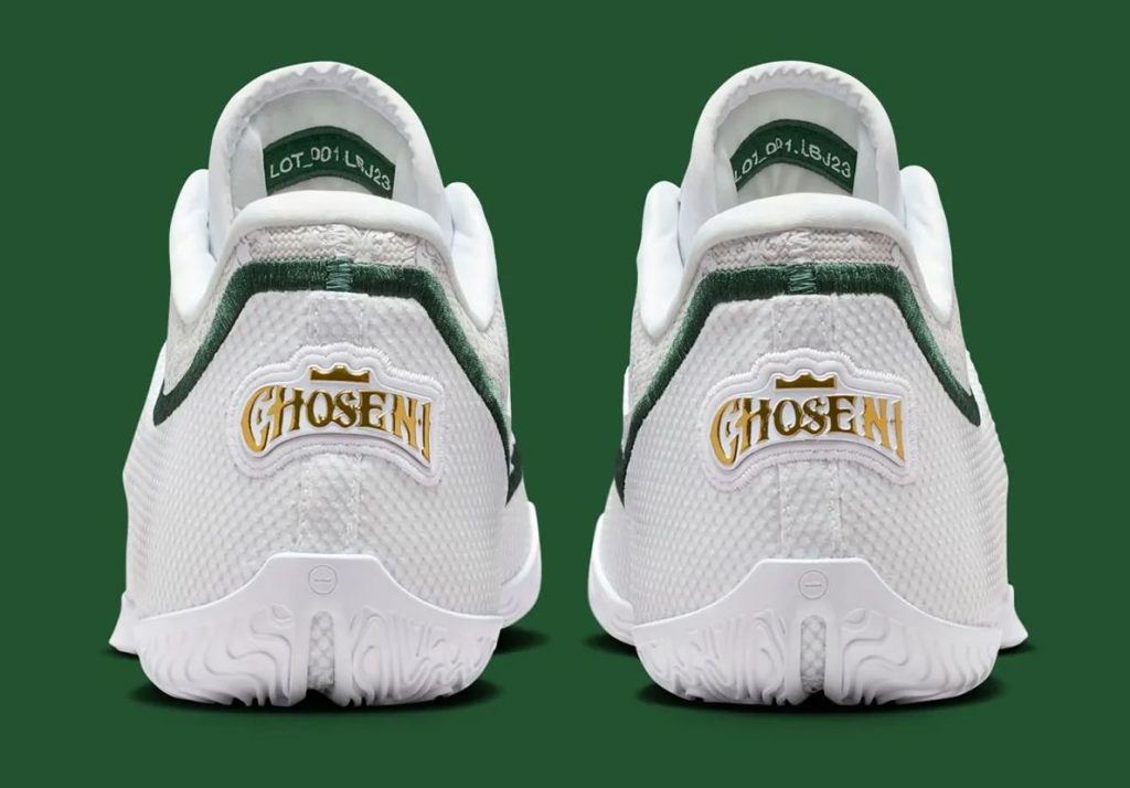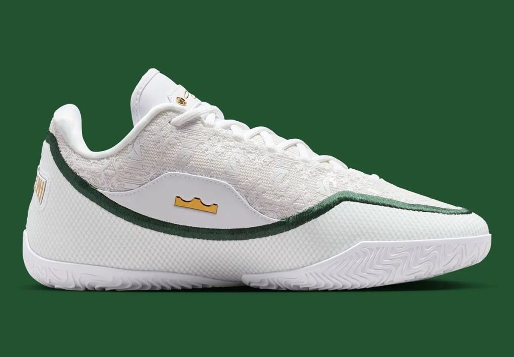 Nike continues its storytelling by incorporating LeBron’s career references directly into the micro-details. The medial heel features a raised emblem of LeBron’s crown logo with a broken-line motif circling around it, symbolizing stages of evolution and reinvention. Inside the tongue, a stitched message reads: